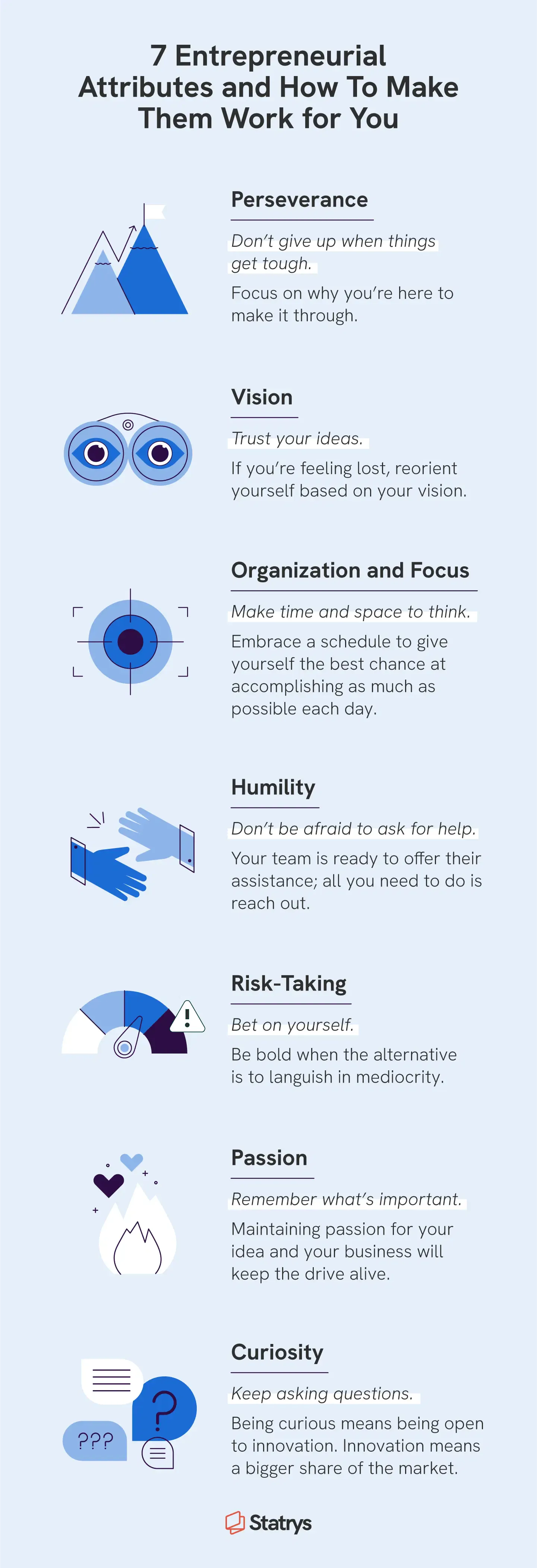 Learning to build off your strengths while reducing the impact of your weaknesses is vital for growing as an entrepreneur. Don’t get discouraged if you see any of these attributes in others and you don’t see them in yourself — other people likely feel the same way about your unique skills.